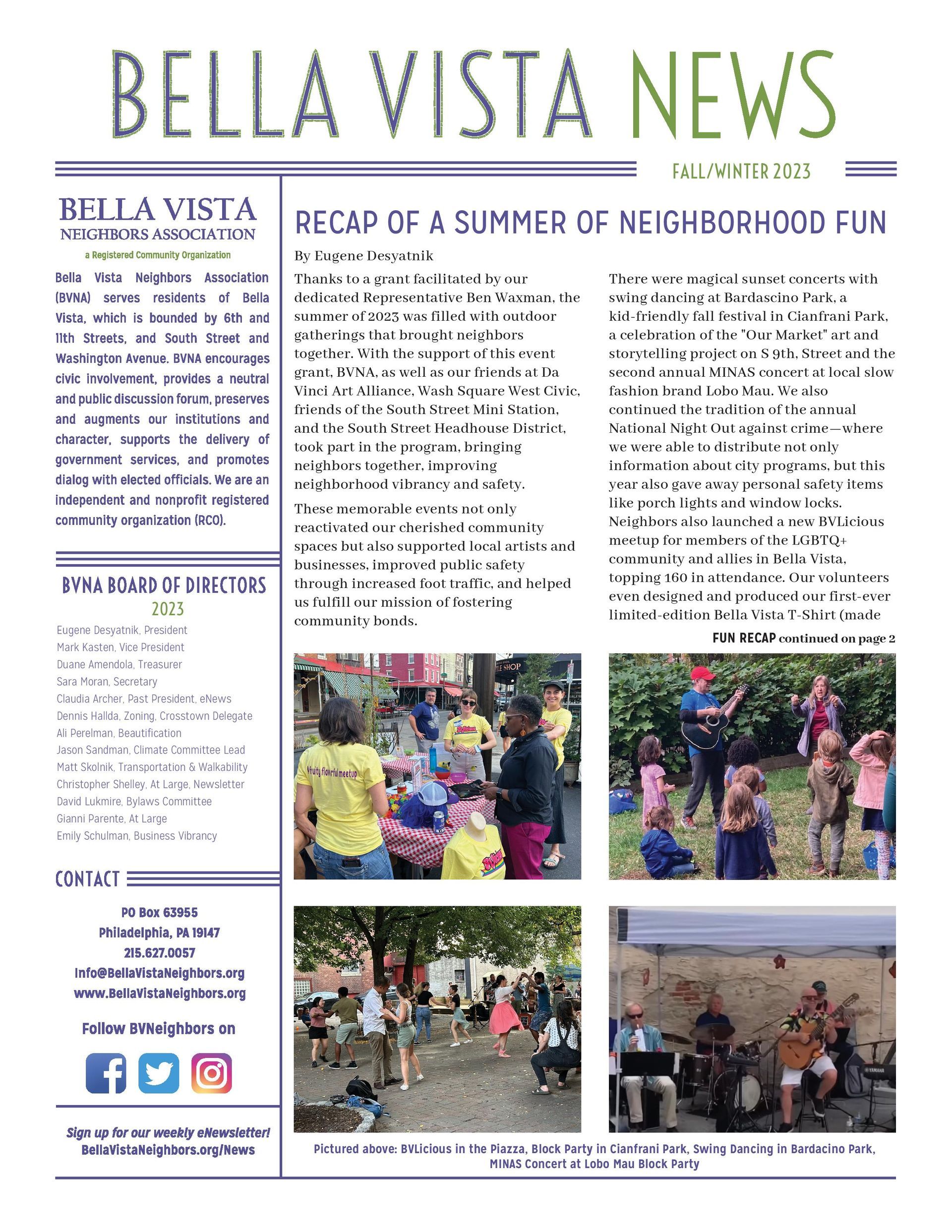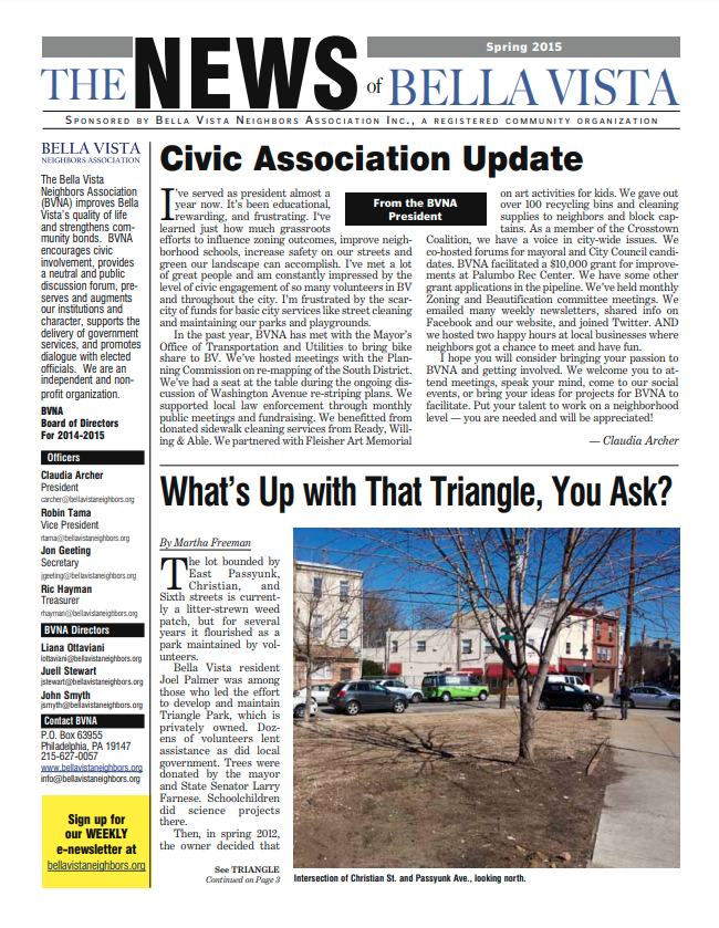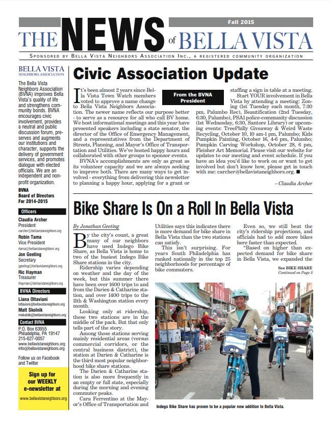 Bella Vista News is a full-color glossy newsletter delivered to over 3,000 mailboxes in Bella Vista. Thank you to the people and businesses who sponsored the last edition. Your support helps make the Bella Vista Neighbors Association possible. Volunteers are needed to assist with the delivery routes; please contact us if you can help!